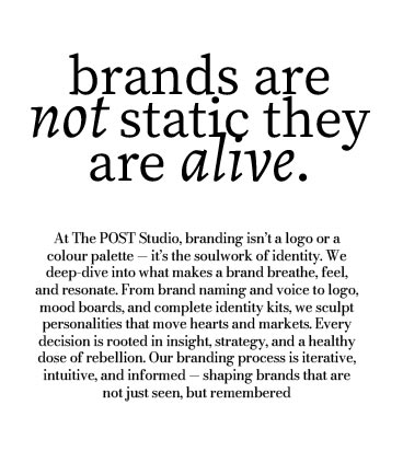 At The POST Studio, branding is soulwork. We shape identities with voice, vision, and intent — guided by strategy, powered by instinct, and finished with a healthy dose of rebellion.